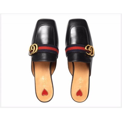 GUCCI/古驰 女士黑色牛皮双G标方头鞋低跟鞋休闲鞋穆勒鞋平跟鞋半包拖鞋凉鞋女鞋