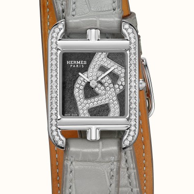 Diamond-set steel watch, dropped setting, quartz movement, diamond-set obsidian dial, "Anchor Chains" set with diamonds, long interchangeable strap in matte pearl grey alligator