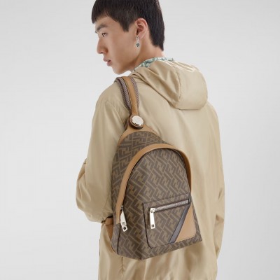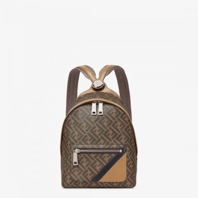 Small structured backpack. This model features a metal rivet with the FF logo that allows the two shoulder straps to be turned into one, allowing it to be worn over one shoulder. Made of brown FF canvas with beige leather details. Front zip pocket with leather twill insert. Two-way zip compartment, internal zip pocket and silver-tone hardware. The shoulder strap with slide adjustment allows the bag to be worn over one shoulder or as a backpack. Made in Italy