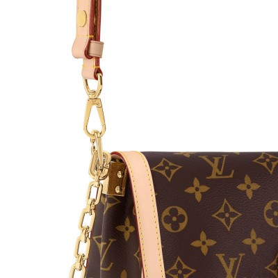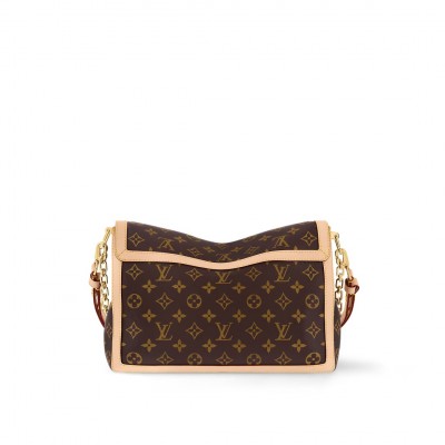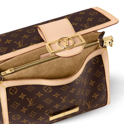 The Dauphine Soft large bag is cut from Monogram canvas and appears on the Spring-Summer 2024 runway. It is trimmed with calfskin leather for comfortable carrying. The classic elements of the Dauphine bag are all present here, including the LV Circle logo on the rectangular lock, and the removable chain and shoulder strap.