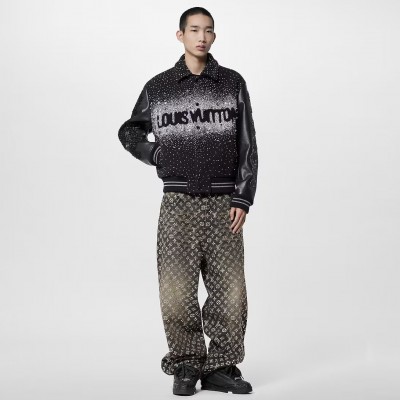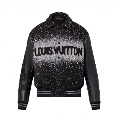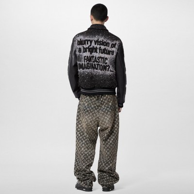This baseball waist jacket is embroidered with crystals and beads in a sparse arrangement, making it a dazzling sight on the Fall Winter 2023 runway. Sheep wool and leather create a dynamic silhouette, with the Louis Vuitton logo and the show slogan embellished on the chest, back and sleeves. Only customizable.